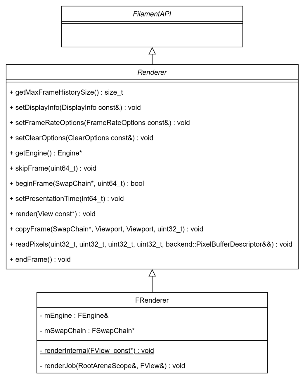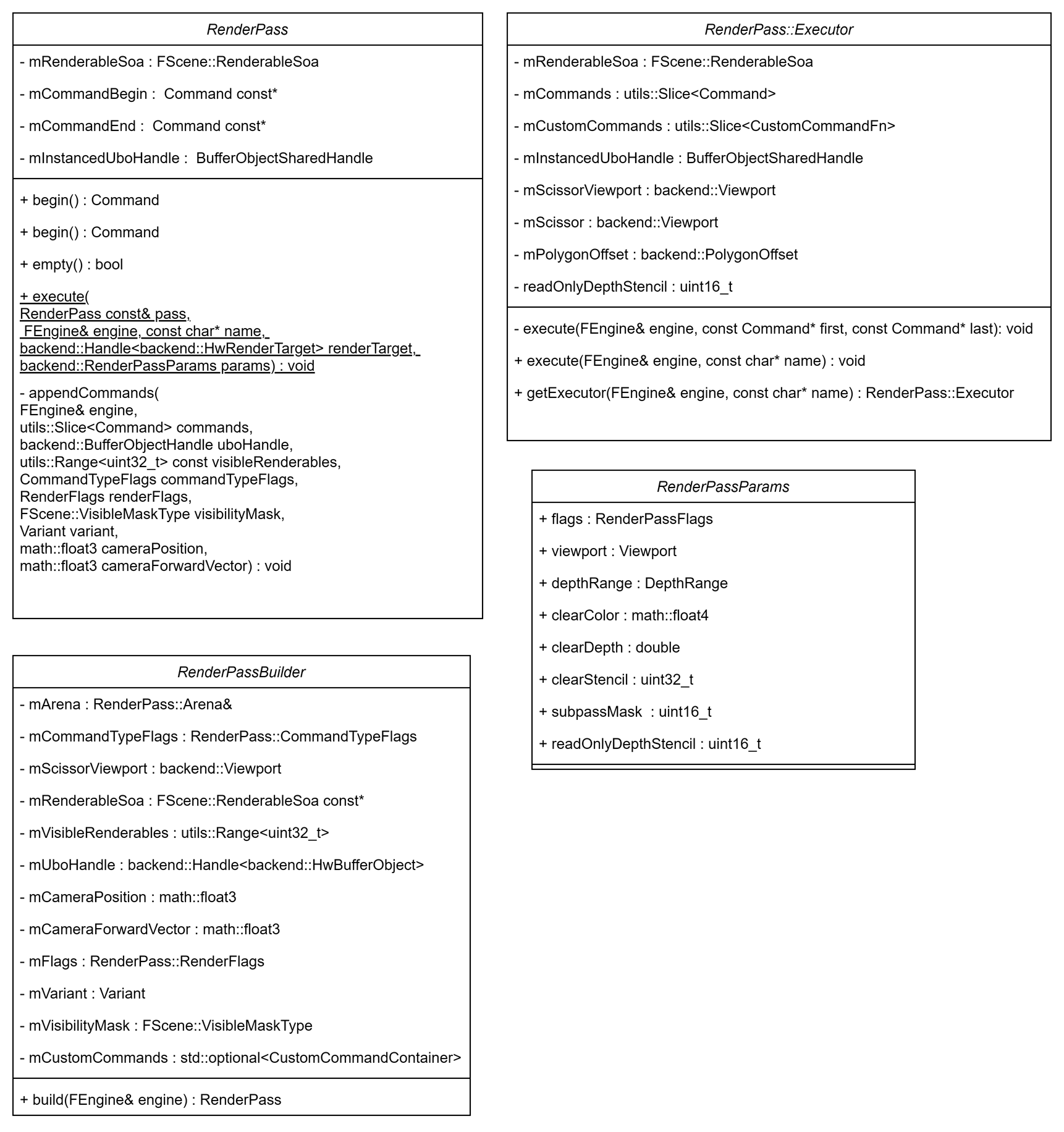 이전에 FRenderer 코드를 보면서 filament의 렌더링이 RenderPass라는 객체 단위로 동작한다는 것을 추론할 수 있었다. 물론 모든 코드를 다 본 것은 아니기엔 예외는 존재할 수 있으나 RenderPass가 적어도 filament 렌더링 동작의 핵심적인 역할을 하는 클래스인 것까진 틀림없을 것이다. filament의 RenderPass는 그럼 어떻게 동작할까? 코드를 보기 전 클래스 다이어그램부터 보자 위 클래스 다이어그램이 RenderPass와 관련된 클래스 다이어그램이다. 클래스 간의 관계까지 표현해두진 않았다. 그리고 당연하지만 모든 멤버가 포함된 다이어그램은 아니다. 거기에 처음보는 클래스도 꽤 있는데... 이런 부분은 당장 알아야할 건 아니므로 넘어가자. 디자인 패턴에 대..
